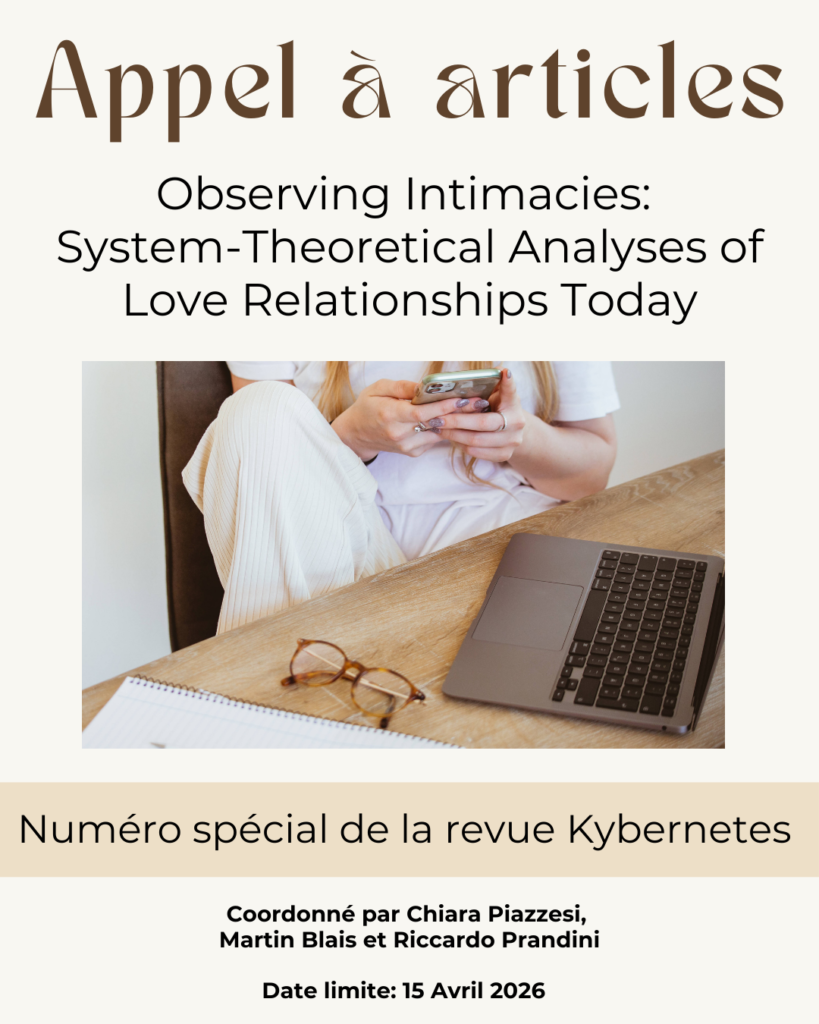 đą Appel Ă articles â NumĂ©ro spĂ©cial de la revue Kybernetes « Observing Intimacies: System-Theoretical Analyses of Love Relationships Today »