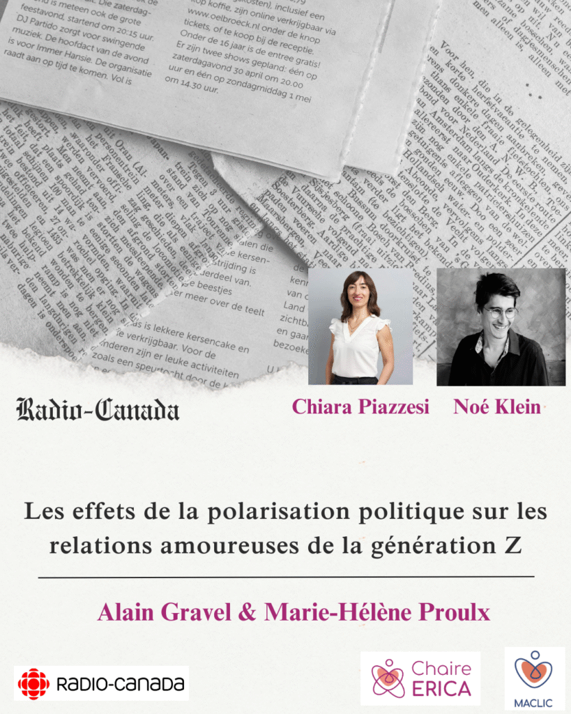 🎙 Le 11 octobre, Noé Klein, coordinateur du projet Maclic et Chiara Piazzesi, titulaire de la Chaire ERICA, étaient en conversation avec Alain Gravel sur Radio-Canada. Ils y abordaient les effets de la polarisation politique sur les relations amoureuses de la génération Z, à partir du reportage de Marie-Hélène Proulx. Réécouter l’entrevue !